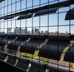 The 6-inch square curved flapper panels are set within 353 extruded aluminum framing support assemblies that span eight stories high by 290 feet wide. Subjected to 130 mile per hour winds to test system resiliency, the system’s anodize finish also contributes to its durability. Class I coating is a high-performance anodic finish used primarily for exterior building products and other products that must withstand continuous outdoor exposure.