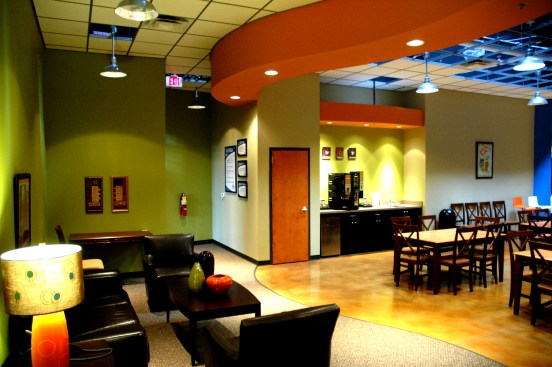 The interior aesthetic evolves around vibrant color selections and curving soffits that create a lounge-like feel. Large skylights and an open ceiling grid allow for an abundance of natural light to flow into the office spaces and breakroom areas.