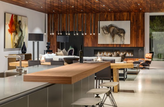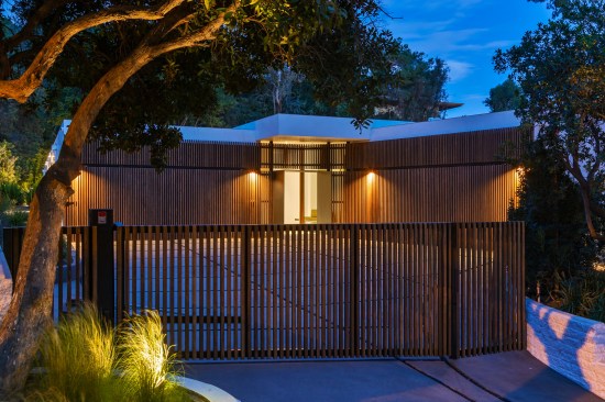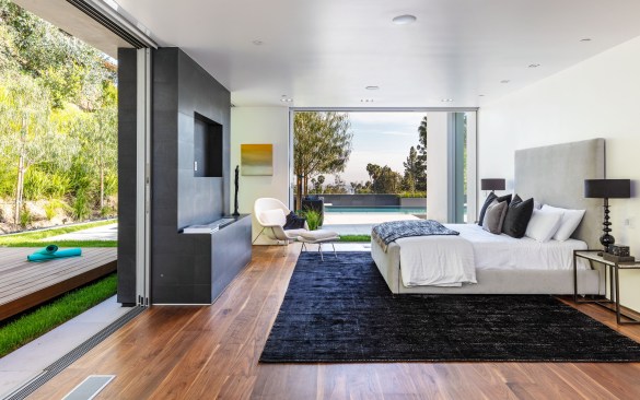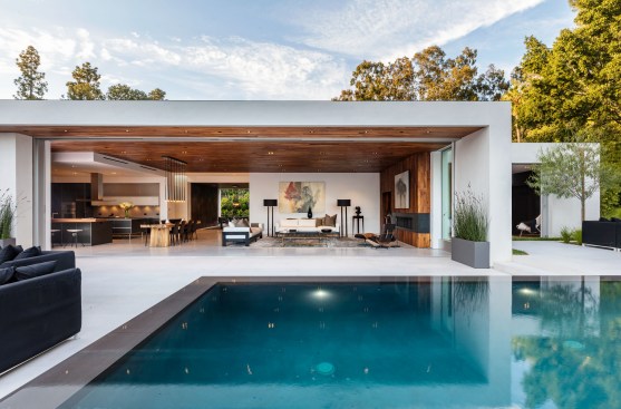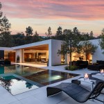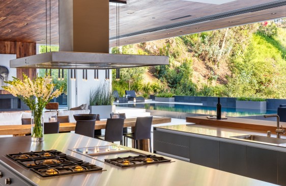 Located in the lower Trousdale Estates in the 90210, the newly built Loma Vista residence is fitting for a bold and creative Los Angeles lifestyle. The open plan maximizes visual and physical freedom by bringing the outdoors in, while walnut ceilings add an artistic touch of warmth. Its floor-to-ceiling glass walls create a seamless indoor-to-outdoor flow, offering natural daylight and a view of the infinite-edge swimming pool. The home has four spacious bedrooms and a master suite complete with a showroom closet and bathroom. Residents enter through the grand pivot door with a soaring hallway and into an open-space living room with a state-of-the-art Bulthaup kitchen just a few steps away. The kitchen is equipped with stainless steel, stone countertops, Gaggenau appliances, and kitchen islands that double as a breakfast bar. A 600-bottle wine wall as well as the alfresco Kalamazoo kitchen and fire pit make it an ultimate entertaining space.