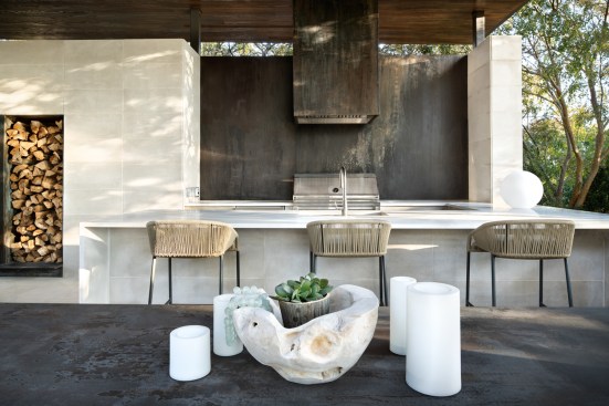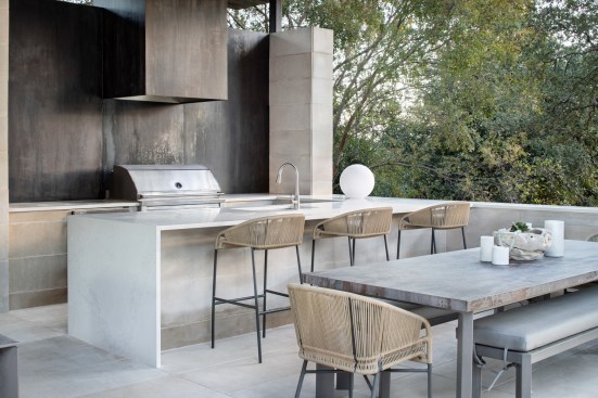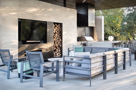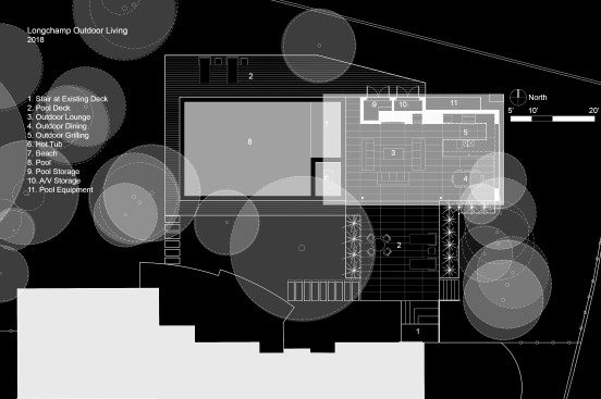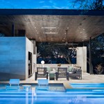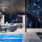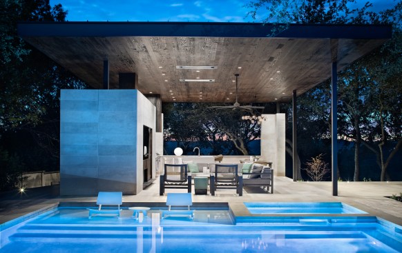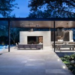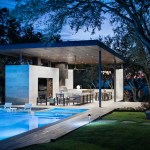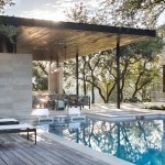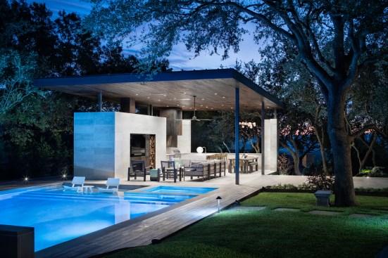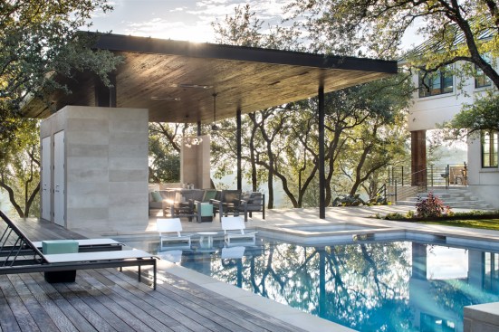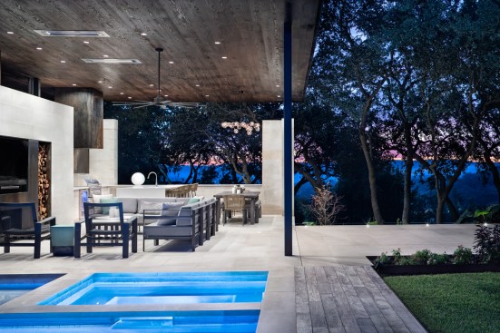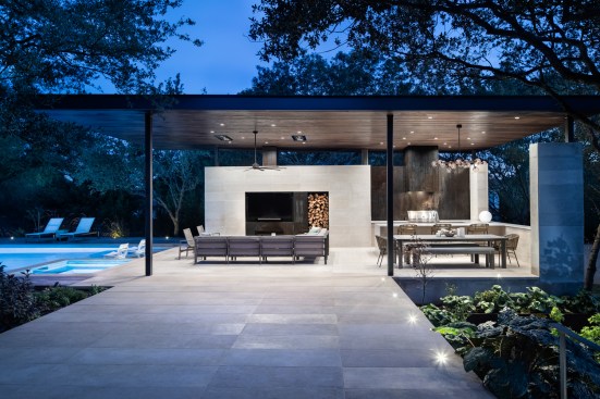 Our Longchamp project developed from the desire for a usable outdoor living space as a complementary extension to the existing home while maximizing the experiences possible at the site. Formally the structure is a steel canopy floating amongst the trees sheltering a series of refined masonry volumes. Its horizontality echoes the low hills that it frames towards the east. To the opposite side the canopy extends just over the edge of the pool, linking them spatially and visually. The wood soffits provide visual warmth and comfort; a contrast to the cool Lueder’s Limestone masonry below. The limestone forms create a mood of enclosure, organizing the space into sitting, cooking and eating. The stone’s subtle color compliments the ever-changing color of the sky. To the East, one can breakfast by limestone framed sunrises just beyond the live oaks. The oxidized steel panels in the fireplace and behind the grill not only provide a visual and practical contrast but formalize space creating focal points to either side as one descends from the house. The project takes advantage of its site and existing residence, creating a serene space for gathering or just taking in the beauty of the Austin hillside.