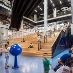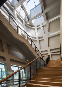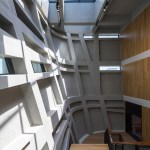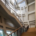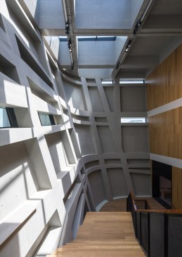 The in-situ concrete structure was carefully designed to become part of the visitors’ experience; wandering through the building is like viewing a cast concrete sculpture from the inside. The structural facade of each volume integrates beams, columns and massive concrete cores, resulting in a building where everything is revealed. The full-height tilted interior spaces at the edges of the volumes become architectural highlights where the visitor can experience the impressive scale of the construction elements.