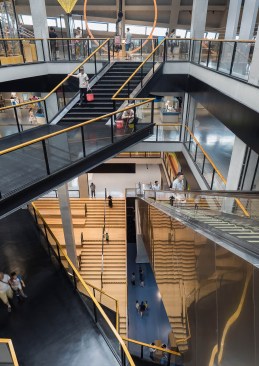 Sitting on a long and narrow 3.8 ha site with strict height restrictions, the building connects the surrounding areas by subdividing the programme into separate volumes. The passages between these buildings, which align with the adjacent roads, provide access from the new business district on the west side of the building to the park on the east. The volumes all have curved edges and tilting facades, which frame dynamic views, shelter public squares and naturally guide pedestrian flows.
