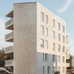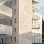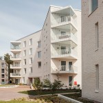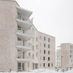 The buildings are characterized by the triangular cantilevered balconies and the narrow windowless northern façade, which is further accentuated by a cloud-like relief made of slightly modified off the shelf bricks.