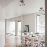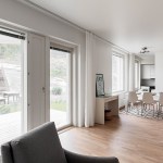 The basic C-shape of the buildings’ floor plan is formed by following the contours of the site. This both enables the buildings to adapt to the demands of the slope and also orientates views from the apartments to the surroundings instead of the neighboring buildings. The triangular shape of the balconies also emphasizes this aspect.