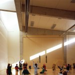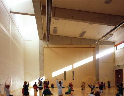 All the teaching spaces, with their ceilings lined in plywood, vary in size and volume, drawing light from different sources. The upper level of the classroom block links across to the Sports Hall Gallery by a 'bridge' suspended over the Dining / Assembly Area.