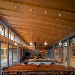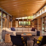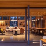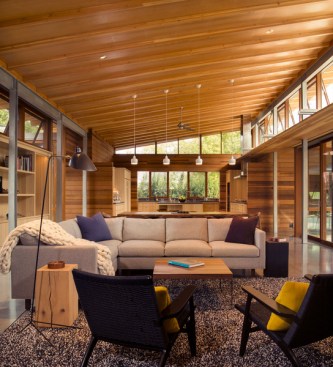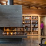 The home is detailed with a natural, crisp palette, reflecting the client’s fondness for simplicity and tranquility. A variety of woods, including Douglas fir, western red cedar, and gray elm, are used throughout and provide a sense of warmth directly contrasted by exposed structural steel, polished concrete floors, and a textured concrete fireplace. A locally sourced Claro walnut table, measuring 10-feet in length, creates a comfortable dining space, its live edge balancing the clean lines of the living room. Additional furnishings reinforce the client’s desire for a minimalist environment.