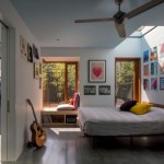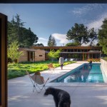 Designed around an existing Japanese maple tree—a vestige of the previous landscape and the relationship shared between residence and site—the house takes full advantage of the Silicon Valley’s mild climate. While windows and doors fill interiors with air and light, they also frame views of the diverse flora surrounding the home. In the living room, a wall of sliding glass doors blurs the line between indoors and out, opening to the back patio overlooking a meadow of tall grasses. In the master bedroom, one can hear the trickling of water and quiet rustling of trees coming from the meditation garden just outside. It is these moments, when the outdoors extend inside, that help anchor the building to site.