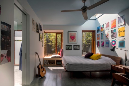The main house is composed of a central double-height living and communal space that runs parallel to the street, shielding the home from the quiet thoroughfare. This common area, which includes a modest kitchen and place for family gathering, connects two single-story volumes, each containing a variety of private and functional spaces. With views from every room, one’s eye is easily drawn outside, where a linear pool and board-formed concrete garden wall, located along the eastern edge of the property, visually connects the main building to the guesthouse beyond.