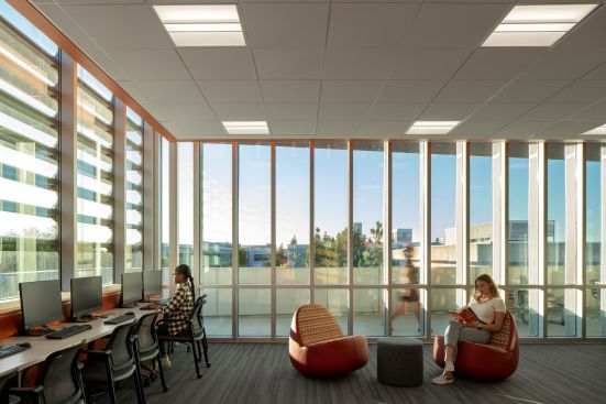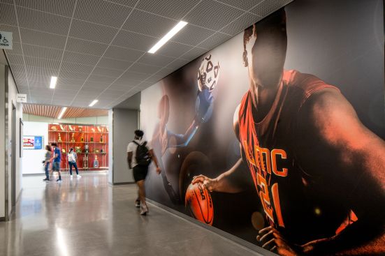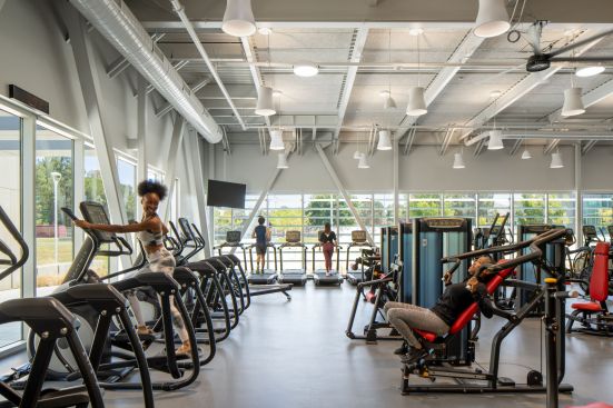 Research shows that students who spend more time on campus fare better academically and are more likely to graduate. The mantra for the Student Union and Kinesiology Complex was “keeping students on campus.” The Student Life spaces on the second floor of the Student Union overlook the campus and act as a beacon to entice students to participate. Large windows in the first-floor fitness spaces in the Kinesiology Complex invite students to be active.
