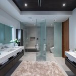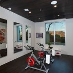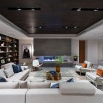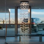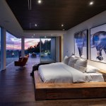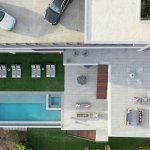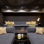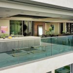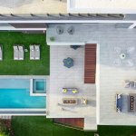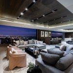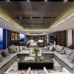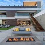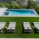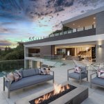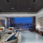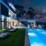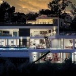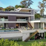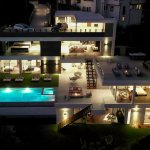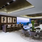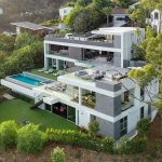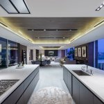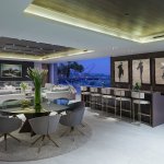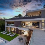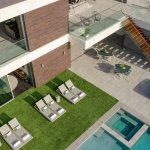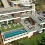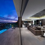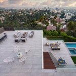 Taking the elevator or stairs down one level from the rooftop parking you reach the kitchen, dining, and living room, which all open out onto a terrace with a bar and dining and fireplace seating. Down another level are two bedrooms/baths, a family room, and owner’s suite, which open onto the pool terrace, featuring entertainment seating and a fireplace. The lower level–also with its own terrace and grass area–holds a home theater, office, wine room, lounge, and gym.