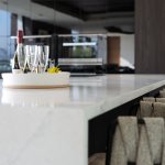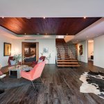 Interiors reflect a warm contemporary aesthetic with the use of plaster, stone, and wood in chocolate tones. Marc also took advantage of an Italian porcelain tile, which looks like a rich, dark wood, for use inside and out, as it requires much less upkeep. At ¼ inch thick, large format porcelain tiles with smooth, subtle veining are now a high-end material replacing stone for flooring. The kitchen cabinets are by Leicht.