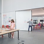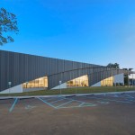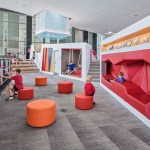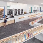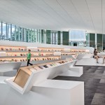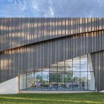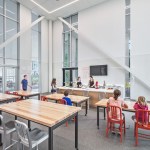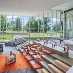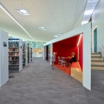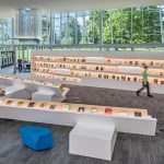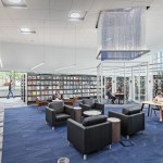 The building’s focal point is the mirror clad maker suite, which accommodates simultaneous events in three interior and one screened exterior space, or allows larger activities to flow between multiple spaces, into the building, and out onto the covered plaza. The material collection is lowered several feet from the entry level, allowing uninterrupted views outward. Patrons descend into the collection primarily along a gently sloped path featuring new and popular materials, while amphitheater tiers and a slide into the children’s collection offer alternative connection points. The unique collection areas, private reading spaces, and partitioned northern rooms are highlighted with lighting filtered through layers of perforated fabric. Daylight penetrates deeply into the space from protected, south facing glass and strategically positioned overhead daylighting devices, minimizing the need for artificial light and creating dramatic moments of discovery.