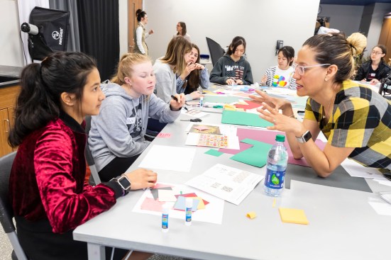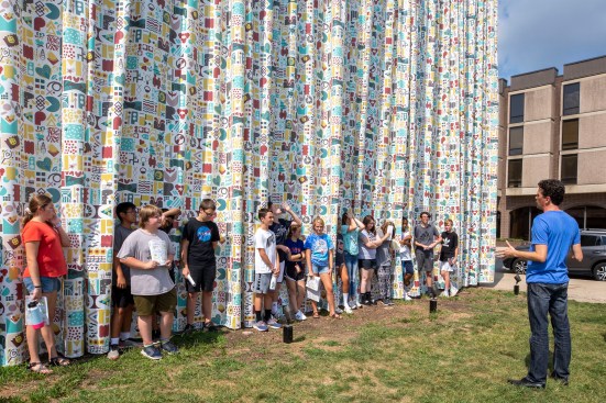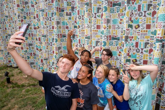 The selected form and material of this collective love letter is inspired by a signature element of theater and performance venues: large-scale curtains. The curtain will be displayed on the Eastern exterior wall of the building, a surface highly visible from multiple vantage points on Third Street given the space in between the Crump Theater and the adjacent building on the Southwest corner of Third Street and Franklin Street. The curtain will cover approximately 30 feet high from the side of the building, and 60 feet in the horizontal direction. Also highly inspired by Alexander Girard’s both urban and textile design practices, the pattern applied to the curtain will be designed in collaboration with members of the community through participatory workshops where they will contribute to the creation a graphic and abstract language guided by geometric symbols and color palette – both inspired by the architectural features and character of The Crump.