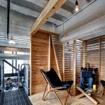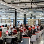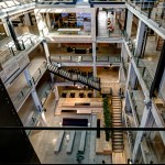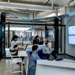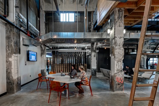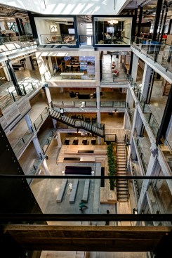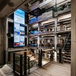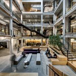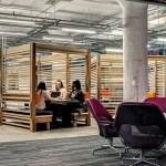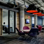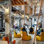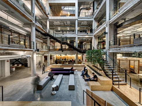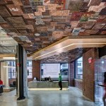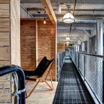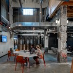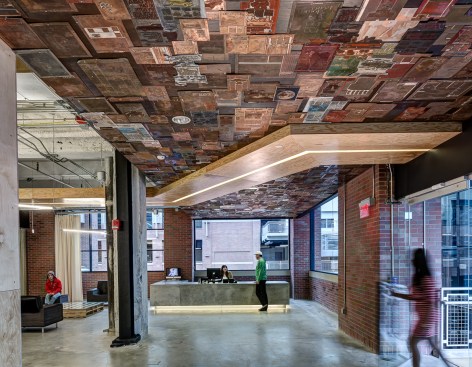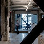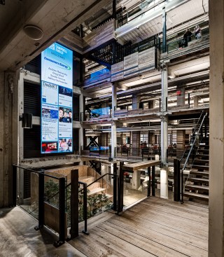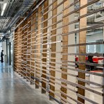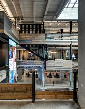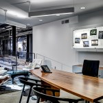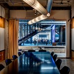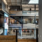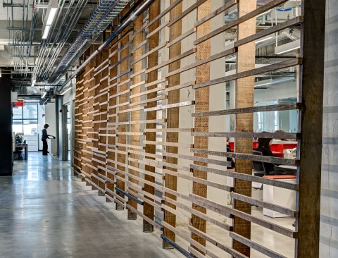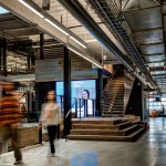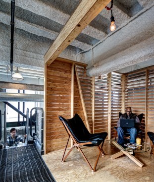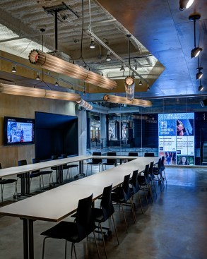 The offices feature benching furniture configurations and minimal fixed rooms. The design also “embraces the ugly” by making creative use of recycled materials including pallets, 500 doors sliced up into slatted partition pods, and conduits used as room dividers. A four-story LED screen with the ability to add messaging provides visual impact. LED lighting, new bathrooms, kitchenettes and some highly designed “pitch rooms” round out the program.