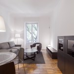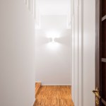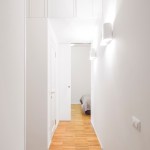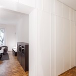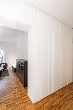 The entrance hall is a neutral space that invites and guides you into the apartment with the various spaces positioned transversally at the end of this small corridor. Bespoke joinery and wall panelling open into a living room with terrace to the right and a spacious bedroom with en suite bathroom to the left.