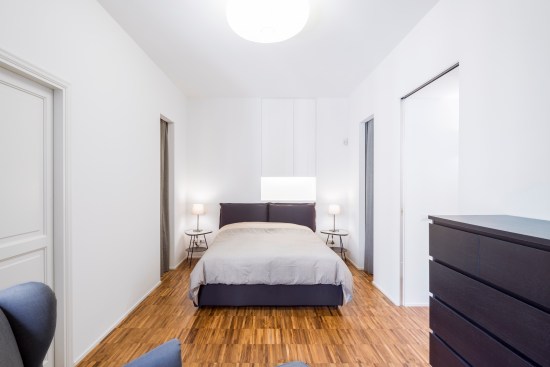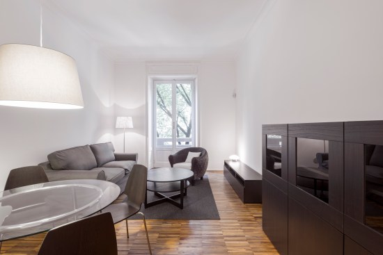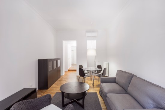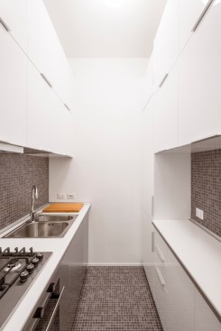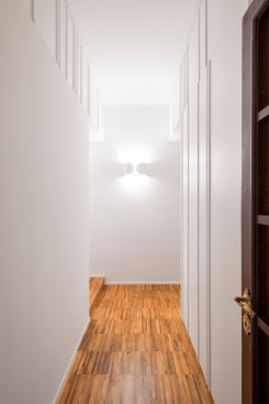 The tall ceilings and the double exposure have been the focal points in the conversion of this Milanese apartment, part of a thirties building. The long and narrow plan has determined a clear division between the living area and the bedroom but also allowed to maintain a good flow from room to room.