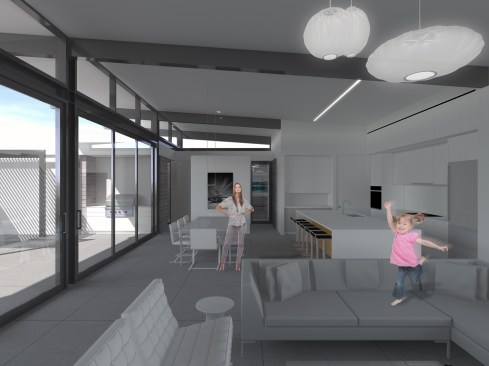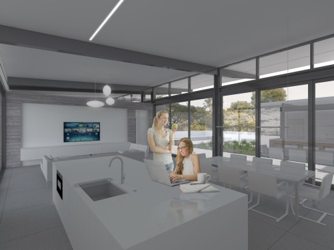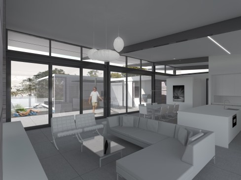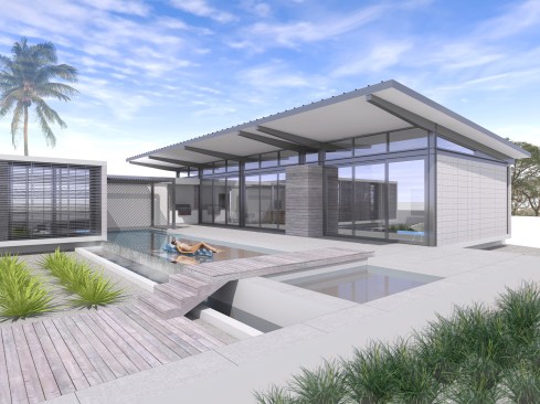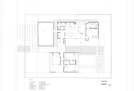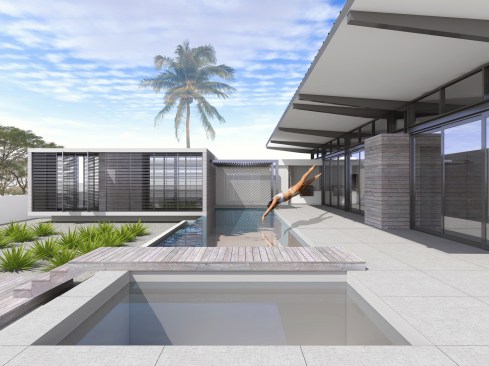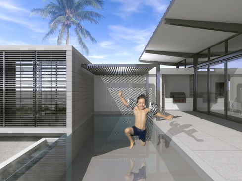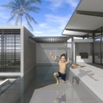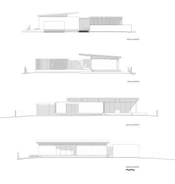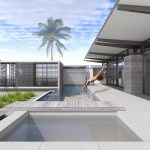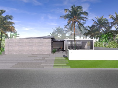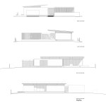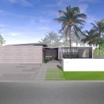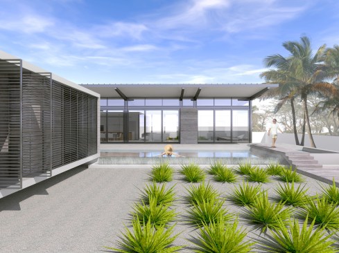 LS1 house is located in the historic Lido shores neighborhood known for its modernist architecture, and mostly for its high concentration of mid-century Sarasota School of Architecture buildings. This particular movement is a reflection of Florida’s subtropical climate and landscape. It originated from Philip Hiss’ desire to develop buildings that provided comfort to the inhabitants in hot and humid conditions at a time when air conditioning was new technology and unaffordable by most people. With the help of local architects such as Ralph Twitchell, Paul Rudolph, and Tim Seibert, an architectural language that responded to these climatic conditions emerged. Large overhangs and trellises were used to shade the buildings’ facades and outdoor spaces. Cross ventilation was generated with the use of large operable windows located on opposing sides of the main living space. Open floor plans allowed breezes to pass through the interior spaces, further enhancing the natural cooling effect. The exposed post-and-beam structure extending beyond the floor-to-ceiling windows minimizing the boundary between the inside and outside. The elevated structures floating above the landscape took advantage of the Gulf of Mexico and Sarasota Bay views. By the fact that these concepts and principles are still relevant and applicable to today’s Florida climate and landscape, the aesthetic of the few buildings that are left seems to have transcended time. LS1 embodies this philosophy by using a similar language of architectural features. The house consists of three pavilions organized around a central axis that longitudinally bisects the site and relates to the circulation from the public street to the private backyard. The central axis creates a sense of mystery as it physically changes form, percolates light, and filters views as one ascends towards the house. From the street, and as part of the entry sequence, the scale of the ground plane is broken down to a pedestrian scale, leading people below an overhead brise-soleil structure that filters light and provides shade. The overhead structure becomes solid when approaching the hidden front door to signify a transition along the axis. Only a hint of the brise-soleil is visible beyond the white glass that separates the public from the private side of the house. Beyond the white translucent glass, the brise-soleil continues, extending over a portion of the lap pool. The filtered light and shadows projects on the translucent glass and is visible to passers by and guests as they continue along the entry sequence. The play of light on the glass surface is ever-changing with the time of day and seasonal sun patterns, further enhancing the arrival experience. Along the central axis, the three pavilions’ volumes transition from a solid and grounded garage on the street side, to a semi-opaque and floating guest/office pavilion that orients both to the street and private yard, and finally to a transparent main living volume that opens itself only to the private yard. On the public side, the dimension of the horizontal wood siding that is applied to the garage pavilion breaks the scale of the volume and minimizes its mass-like appearance. Operable slatted shutters on the guest/office pavilion offer filtered views to and from the structure. They also regulate light and shade levels and can be adjusted according to the intensity of the sunlight at different times during the year. Partially opaque and partially transparent, the elevated pavilion appears light as it hovers above the surrounding landscape. Finally, the third pavilion’s transparency is achieved by exposing its post-and-beam structure and providing floor-to ceiling windows that open onto the lap pool and private back yard. Cross ventilation is provided by the absence of interior walls in the public spaces and the location of operable windows and doors on opposing sides of the living spaces. Large overhangs were designed to restrict the intense Florida sunlight and heat from penetrating the pavilion during the summer months, while allow sunlight to filter in during the colder months to provide warmth.