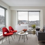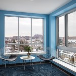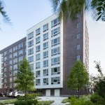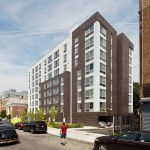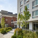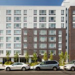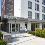 Ludlow Commons is an 8-story, 71-unit affordable senior housing development in Yonkers. Built under HUD 202 guidelines, the building includes 70 one-bedroom and 1 two-bedroom units with full kitchens and bathrooms to support independent senior living. Located on the perimeter of downtown Yonkers, Ludlow Commons is a short distance from the retail and community facilities center of the city, and easily accessible by the MetroNorth RailRoad. The apartments on the west end of the building enjoy views of the Hudson River and Palisades beyond. On the ground floor the day-lit elevator lobby, a generous community room with kitchenette, and three program offices for Westhab, the senior services provider, occupy most of the space. The super’s apartment and laundry room as well as equipment and systems rooms occupy the rest. While the community room and laundry room look on to Ludlow Avenue, a landscaped rear garden provides access to the outdoors. The building is set back at Ludlow Avenue and a large landscaped field separates the entrance from the street; a slate wall/bench offer seating at the front door and indicate a path to the rear garden. Supporting the welfare and active lifestyle of the senior tenants was an important focus of the design process. At each floor the elevator lobbies are extended to include a small sitting area with large windows that allow daylighting and views across Yonkers. At night, the lobbies glow onto the street creating a safe building entrance. The two building stairs are brightly lit with large windows and colorful wall treatments making them appealing to use for vertical mobility, important in senior housing. The building has green/sustainable measures such as FSC certified hardwood floors, linoleum Forbo floors, engineered concrete stone floors, high-performance, energy efficient windows, passive solar orientation and photovoltaic panels. The building is LEED Gold certified and NYSERDA's Energy Star Multi-family Program compliant.