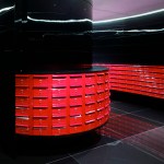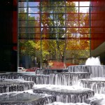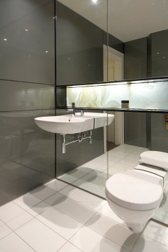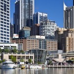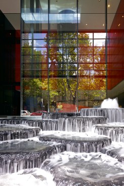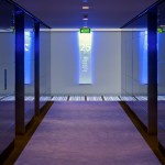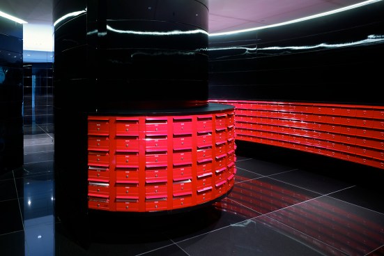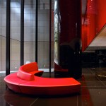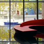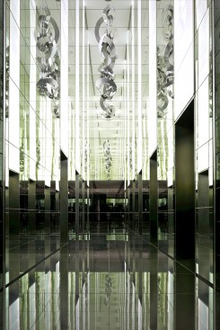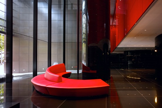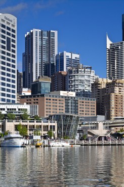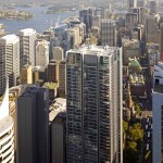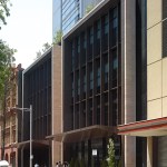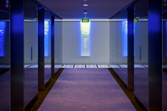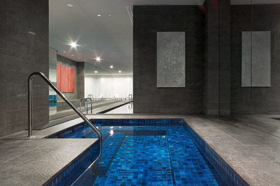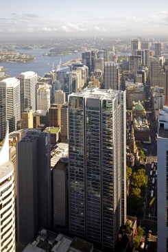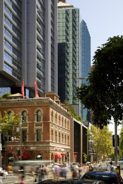 The towers rise above a five-storey, sandstone-faced podium that knits into the surrounding block and responds to the scale and materials of the adjacent buildings, which are of varying size, character and function. The towers are set back to create a generous terrace on the roof of the podium; and upper floor provides recreational facilities for residents, including a 50-metre swimming pool, which is suspended dramatically over a triple-height entrance lobby. The lower levels offer a wide variety of shops, galleries and cafés that line a series of full-height, glazed routes or 'lanes', which are entered from the surrounding streets. These connections resonate with Sydney's distinctive Victorian arcades, which were an earlier response to the high density of the historic city quarter.