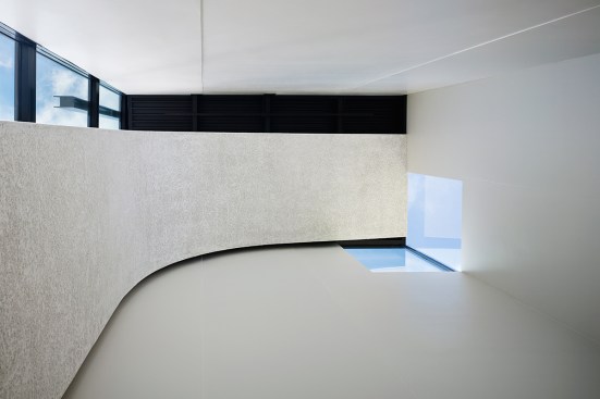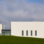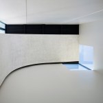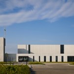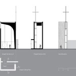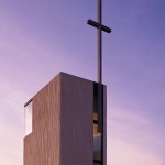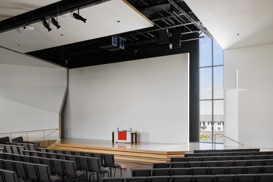 The gathering wall, which grows from the chapel form, gradually increases in porosity to provide views to and from the worship environment. These porous walls will always remain the primary focus, serving as an organizing device to inform facility growth over time. The volumes of the church are contained within a simple rectangular footprint wrapped by smooth, white concrete walls. Windows are selectively placed to provide daylight to interiors while animating the exterior in contrast to the neighborhood. Within the worship space, white interior folded wall surfaces continue to wrap space and volume and culminate in a glass cross that is revealed through light.