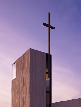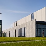 The site and structure is organized at an angle to the grid of the city to create an activated relationship to the street. The sloping site allows the entire facility to have an accessible lower level adjacent to parking. The 24/7 chapel anchors the structure to the site, reaching upward with a symbolic cross, and reaching outward with a wall that forms the southern face of the main gathering space. These concrete forms are sculpted with a texture that creates depth through the undulating levels of sunlight and shadow throughout the day.