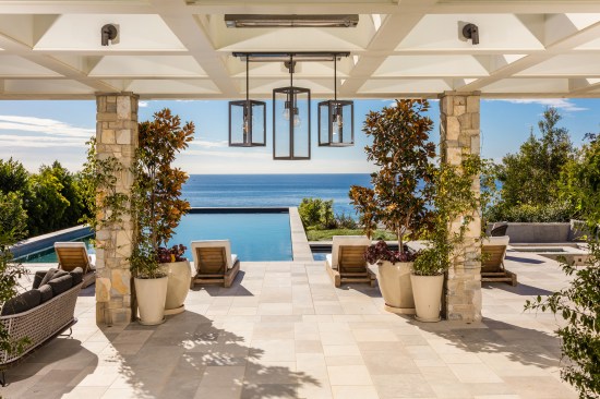 An open-air pavilion includes a fireplace and an outdoor kitchen with a grill, pizza oven, and bars. A resort-style pool, sunken lounge area, and fire pit are silhouetted by the ocean. A one-bedroom, one-bathroom guesthouse is located on the property. The home is currently on the market for $57.5 million.