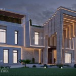 Beautiful facade of the villa with conceptual lighting highlighting the architectural details complimented by the elegant landscape.