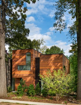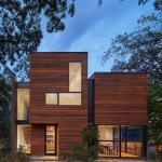 Lyon Park, in Arlington, Virginia is an “urban village” near Washington, DC. Most of the houses in this established neighborhood were constructed in the 1920’s and 1930’s. The houses vary in style, ranging from small single-story bungalows to larger wood and brick colonial revivalist houses. Streets are tree lined and the topography is gently rolling. After living in their house for about seven years, a young family of four hoped to transform their colonial house to better fit their lifestyle. A series of small but cozy rooms failed to connect with each other and to the deep, sloping landscaped backyard. Excluding the basement, the existing house comprised less than fourteen hundred square feet, with two bedrooms and only one full bathroom. Ideally, the transformation would retain the “sense of home” while providing spaces open to each other, additional bedrooms and a better connection to the landscaped site. A building that avoided stylistic mimicry with modern light filled spaces was desired. Sustainable construction techniques and the use of environmentally sensitive materials were expected. The budget for this project was moderate. The result is a modest, restrained and compact modern renovation project that respects the scale and rhythm of the street. The project combines three small additions, totaling two hundred fifty square feet with a complete reconfiguration of the existing spaces. The existing second floor exterior walls and roof were removed and rebuilt to provide spaces on the second floor with high ceilings and light filled spaces. On the main level, floor to ceiling windows allow expansive views to the backyard, while large windows on the street side insure a connection to the neighborhood. The previously dark and compartmentalized house is now open and flooded with light. The FSC-certified wood siding, combined with gray stucco and charcoal fiber cement panels provide a quiet, warm exterior that recedes into the tree lined streetscape. The compact massing with simple fenestration is organized to respect the scale of adjacent houses. A rain screen system is employed to provide a ventilated envelope. Windows with high level efficiency ratings provide transparency and light transmission without compromising the performance of the envelope. Ultimately this is a modest project with a moderate budget. Although this project is very small on many levels, the impact on the lives of this family of four is substantial.