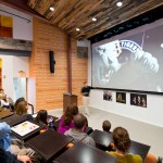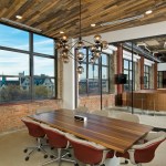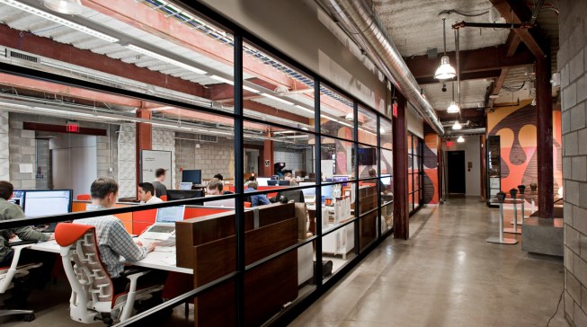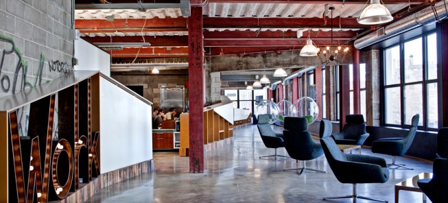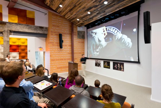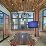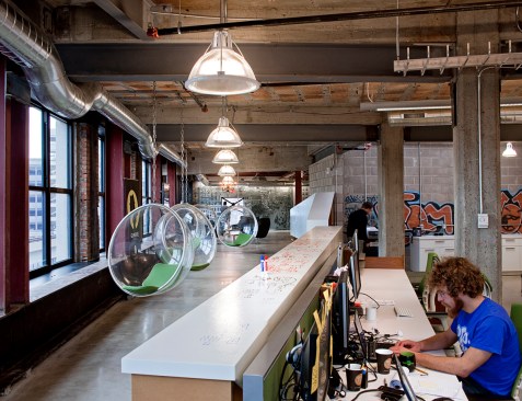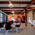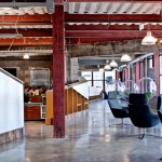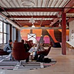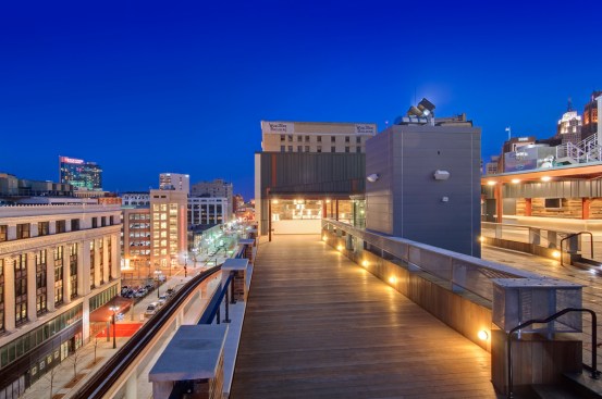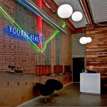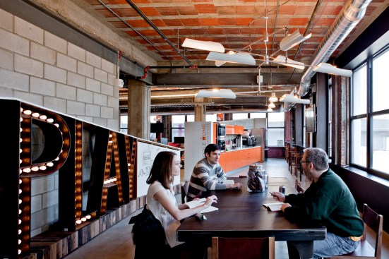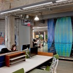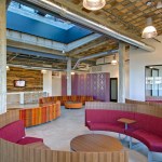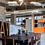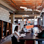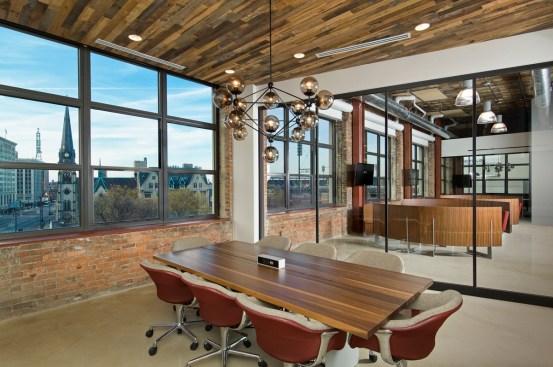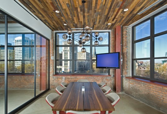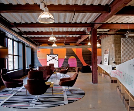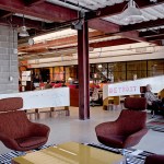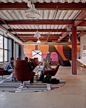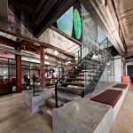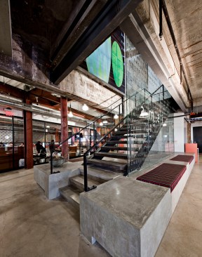 The design combines the existing rawness of clay tile ceilings, exposed brick, steel columns and beams, and concrete floors with instances of playful graphics, urban light sculptures, and modern furniture. Open office space with benching style workstations fosters collaboration. Several break-out spaces are provided throughout the floors, separated by low meandering walls with writable surfaces for brainstorming. Bold, abstract graphics and vintage maps and photos of Detroit create unique environments. Etched lettering on glass panels at the stairway adds interest to the monumental staircase. The fifth floor offers state-of-the-art meeting and gathering spaces, including a two-story auditorium. The roof deck provides a unique event space featuring dramatic views of the City.