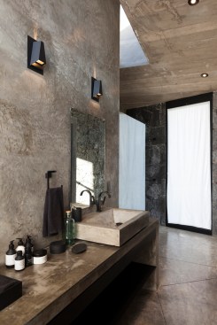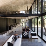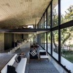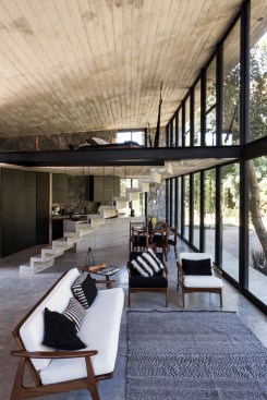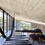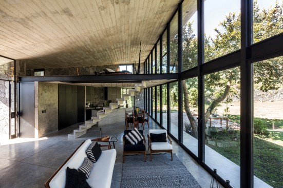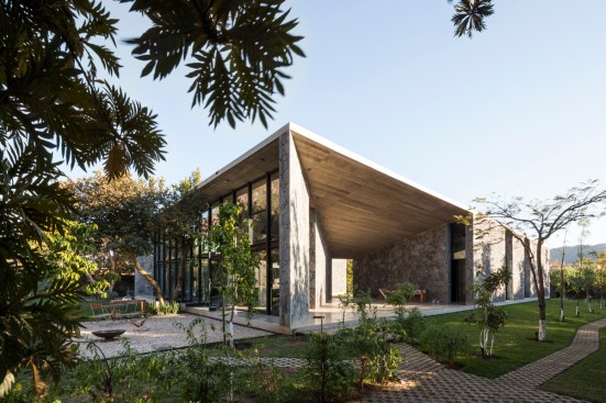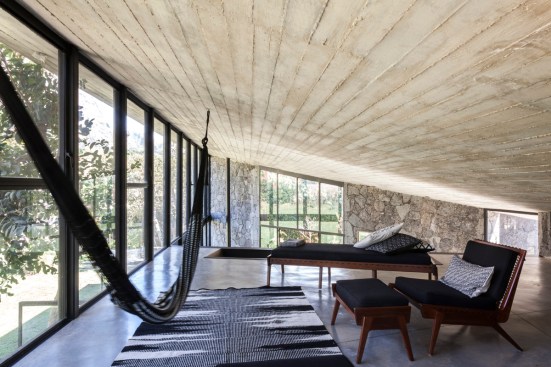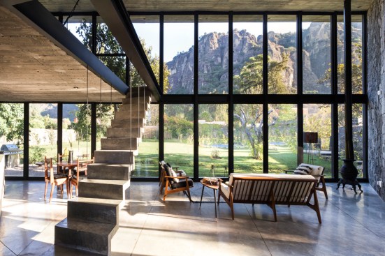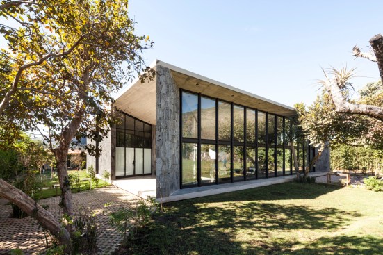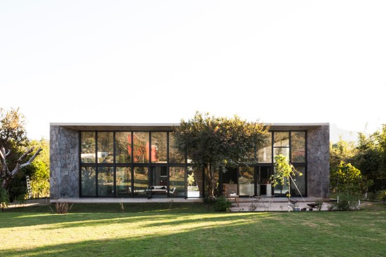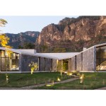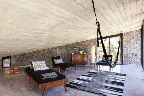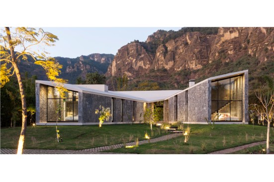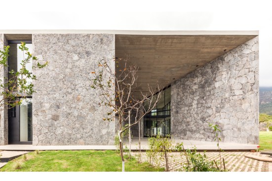 The house is finally drawn as the addition of three pavilions unified by a unique roof, generating two covered patios; the roof is continuous, and rests on top of the structural stone walls that are the main asset of the house, the texture, a rough and imposing material that builds up the space, and reinforces the views and the power of nature. The house is a sequence of open and ever-changing relations with the nature; and always, as a backstage, the two immense mountains of Tepoztlán.