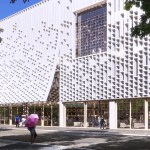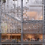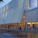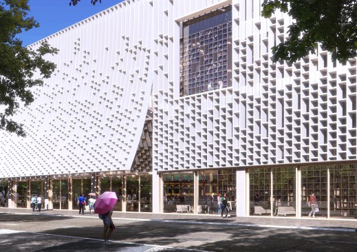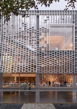 The façade takes inspiration from the former modernist design of Hotel Estoril by filtering the light and creating a controlled indoor climate. An intriguing play of light and shadow is projected onto the floor and walls of the library. The continuous ‘L’ shape that defines the library volume and its uniform facade helps to redefine the square.The façade pattern acts as an extension of the bookshelves, from the inside out, from stack to protective shell. The uniform skin wraps the library volume and opens up like a book page to the main entrance facing the Tap Seac square. This welcoming gesture is an essential part of the relationship between library and square.