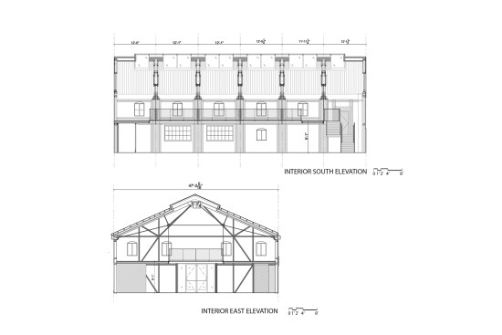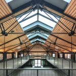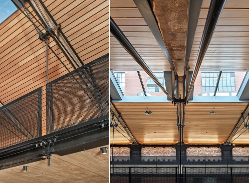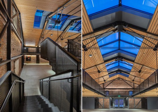 The team began the project by demolishing the prior interior additions, which revealed the building’s original brick, wood, and steel bones and full volume. After refurbishing these crucial architectural elements, the firm added state-of-the-art steel braces and diaphragms to ensure the structure’s seismic soundness for the next 100 years. The architects also incorporated new structural ridge skylights overhead, allowing natural light to penetrate the space, and a king-post truss system to create a column-free interior.