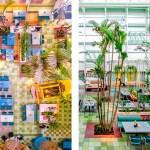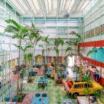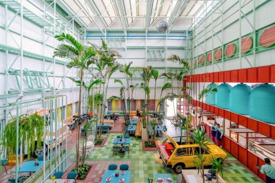 The urban highway scale of the exterior is paired with a lush, highly detailed interior- a pastiche of technical and traditional elements. Exposed steel structure, skylights, louvers, are expressed to emphasize the building’s systems. Reclaimed rainwater is collected in bright blue tanks to water fifteen-foot palm trees which partition the open floor plan. The floor is made from a patchwork of cement tiles, new and recycled building material from local exterior patios. These elements combine with custom millwork and furnishings vibrant colour palette and tropical vegetation to create a space that is at once familiar and refreshingly unexpected.