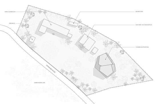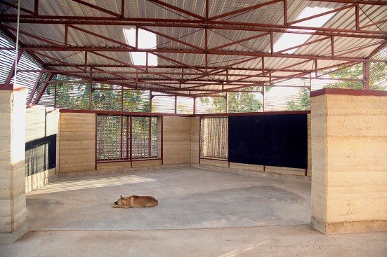 The building is designed with playful, massive shapes assembled together for children to engage and explore. Natural, locally sourced materials are used throughout the building to integrate the object within its surroundings. The center is visible from afar, an enticing destination for the long distance that many students travel to come to school.