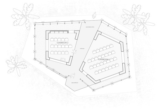 The large classroom volumes feature blackboards, built-in wall benches and storage space. An open floor plan allows for flexibility in the arrangement of the learning areas. The interior is illuminated with soft, natural light using skylights.