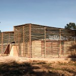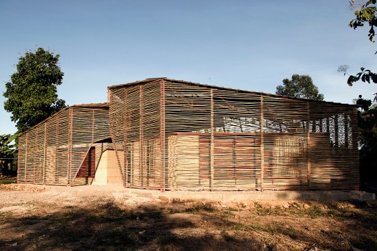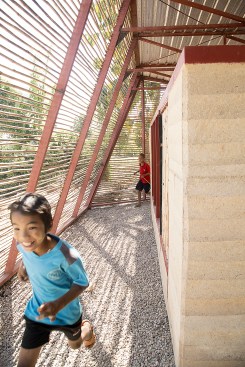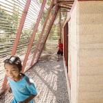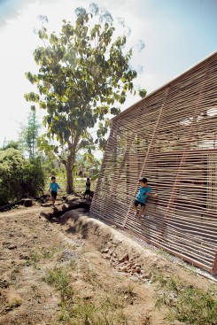 A delicate, veiled bamboo skin wraps the interior spaces, creating a world of passageways and spaces for students to discover. Sunlight is filtered through, adding depth and volume to the building. The bamboo skin acts as an environmental mediator, screening the interior rammed earth walls from direct sunlight and rain while welcoming fresh air and breeze to pass through.