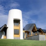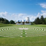 Maggie’s Dundee (2003) is the only permanent building in the United Kingdom designed by Los Angeles architect Frank Gehry. An intimate structure atop a Scottish hill, the white, cottage-like building with a wavy silver roof is modeled on a traditional Scottish “butt n’ ben” dwelling, a two-roomed home comprised of a living and kitchen area, and a bedroom. The curves and folds of the interior timber structure envelop visitors, with spaces organized around the central social area of the kitchen table. In a video accompanying the exhibition, Gehry recounts how he imagined his friend Maggie Keswick in a dream suggesting that he tone down his originally more exuberant design proposal. The completed site includes earthwork mounds and a labyrinth designed by landscape designer Arabella Lennox-Boyd as well as signature artwork by sculptor Antony Gormley.