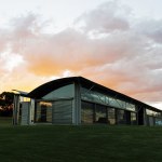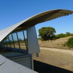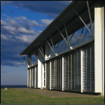 The striking roof form also registers the architect,s development of a pavilion type with a distinct front and back and this dominant spatial orientation is primarily developed in relation to climatic considerations. The open northern face is treated as a glazed sliding screen with individually adjustable and retractable external louvres. The large angled roof overhang shades the building from summer sun and allows winter sun access. In sharp contrast, the lower rear wall facing the predominant southerly winds is largely closed and is constructed of reverse brick veneer. Continuous upper fixed glazing along the southern façade admits light and sky views. These glass panels slope away from the wall to accommodate continuous adjustable horizontal vents at door head height.