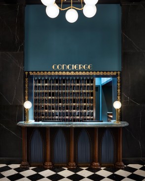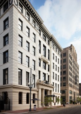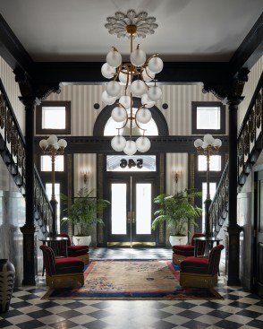 Inspired by the building’s storied history, the designers breathe new life and purpose into the building via several design interventions. A restored monumental entry portico covered by an ornamental iron and glass canopy defines the entry into the building. Upon entry, a new archway helps emphasize the foyer’s verticality, while diffused lighting and custom mauve-lavender paint round out the soothing private sanctuary. The original historic grand stair was preserved and continues to function as the primary entry to the building. A new, bespoke concierge desk welcomes and orients guests. Along with a variety of original lighting fixtures and historic windows, colorful marble floors, French wallpaper, and a carefully curated selection of furniture—including skirted armchairs, copper-topped tables, and elaborate Roman mosaic-tile baths—complete the aesthetic. Wherever possible, the design team worked to maintain a variety of original lighting fixtures. The Living Room serves as a lobby where guests can play board games, host a meeting, or have a pre-dinner cocktail—all under light fixtures inspired by corset boning. Bar Marilou, the aperitif bar, was developed by Quixotic Projects and features a separate address and entrance from the hotel (the bar is also accessible from within the hotel). Local artists and artisans contributed to the design with pieces unique to individual rooms within. The project included meticulously restoring key historic elements, modernization of building systems, and upgrades to the building’s stormwater management system (designed in collaboration with Spackman Mossop Michaels) to meet the City of New Orleans’s new resilience initiatives for stormwater.