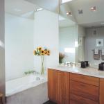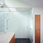 Because the room is only 143 square feet, Alter used the ceiling plane to articulate function instead of taking up floor space with dividers. An entry vestibule is devised by keeping the ceiling low around the door and a linen closet but letting the center section vault up to clerestory windows above the vanity. Alter says he “treated the shower and bath like little sidecars and dropped the ceilings above them.” He adds that lowering the ceiling above these areas helps trap steam to keep bathers warm.