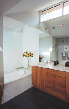 Kevin Alter sees architecture as a backdrop rather than a leading character in a custom home. This new Austin, Texas, master bath shows off his design philosophy with clean lines that allow interesting finishes and natural light to attract attention. “Because everything is clean and simple you notice wood grains and patterns and changing light through the course of the day,” he says.