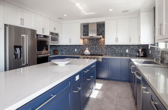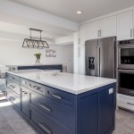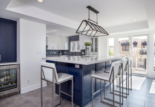 This updated transitional kitchen was completed for a family in Hermosa Beach, CA with the goal to incorporate a previously forgotten dining space. Our clients wanted a kitchen that felt comforting yet modern, which our designers achieved by mixing a soft blue color scheme along with striking white countertops. The long island serves as the centerpiece of the kitchen, offering plenty of space to prepare meals and entertain guests. The new dining table is accented by a beautiful, angular chandelier that ties the entire space together. In order to make use of this incredible kitchen layout, we wanted to give our clients maximum storage space. We did this by incorporating drawers on the base of the island, and cabinets both above and below the perimeter countertops. For the surface materials, our clients chose Cambria Ella for the island countertop, and the perimeter is Caesarstone Pebble. All of the beautiful silver appliances are KitchenAid. This project was a collaborative effort between our clients and our designer Beth Yuen. We loved incorporating every inch of previously unused space so that this family can make plenty of memories in their kitchen and brand-new dining area.