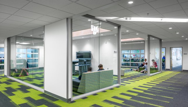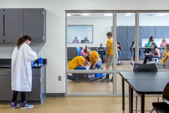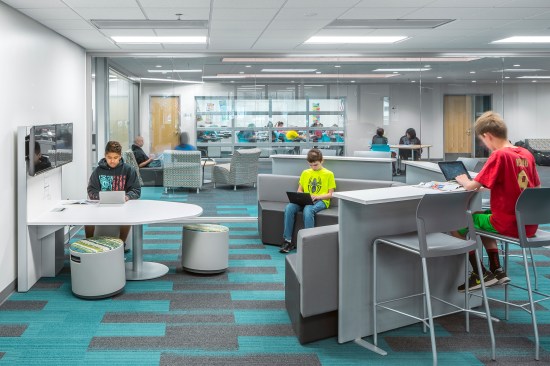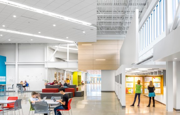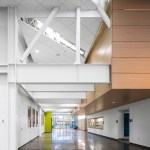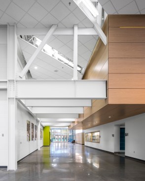 Jordan School District wanted to re-imagine its middle school, constructed circa 1960, into a flexible learning environment capable of supporting a STEAM (Science, Technology, Engineering, Arts and Math) program. DLR Group was engaged to work with the school’s stakeholders, investigate various grade level clusters and numerous educational delivery concepts, then design an extensive renovation and addition program to respond to the district’s vision that completely changes its educational delivery. Simultaneously, the district opted to construct a major addition to the middle school to house a new Community Education and Recreation Center (CERC) to offer all community residents a needed fitness and recreation space. The resultant facility apportions students into two academic clusters housing 5/6 grade students and 7/8 grade students, each with classrooms, labs and teacher support areas, flexible enough to accommodate a variety of configurations for student work. The facility’s original shared common areas are receiving minor renovation work. The design team devised a creative adaptation of the building’s core, using existing structural columns and raising the roof an additional 15 feet, to house an expanded mechanical system and bring natural light deep into the commons area through a series of clerestory windows. The raised section also serves to define a new secure entrance adjacent to the school’s administrative offices.