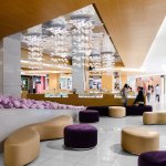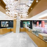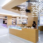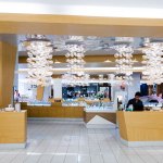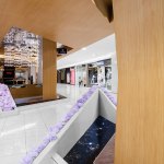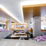 The design solution creates floating wood soffits spreading out to form focal points above boutique kiosks and cafes, defining the heart of the space. Water is used as a visual, experiential and auditory design feature to connect the space to the natural environment. Shallow pools surround public seating areas and specialty cantilevered retail. Elegant water walls punctuated with flowers suspended in crystal vases greet the guest at each entrance and set the tone for the distinctive experience inside. Warm wood patterns, relaxing seating groups and a color palette of cool colors and soft tones brands the area as a high‐end shopping destination in line with the Aires brand.