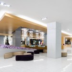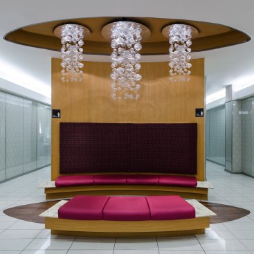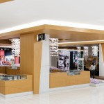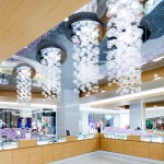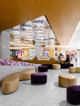 Light lined canopy wood soffits float above the boutique kiosks and cafes, defining a more intimate experience for both the retailer and the shopper. The center of the wood canopies over the spaces and lined with antiqued mirror. Glass bubble light fixtures hang from the mirrored surfaces and create duplicate fixtures within the reflections.