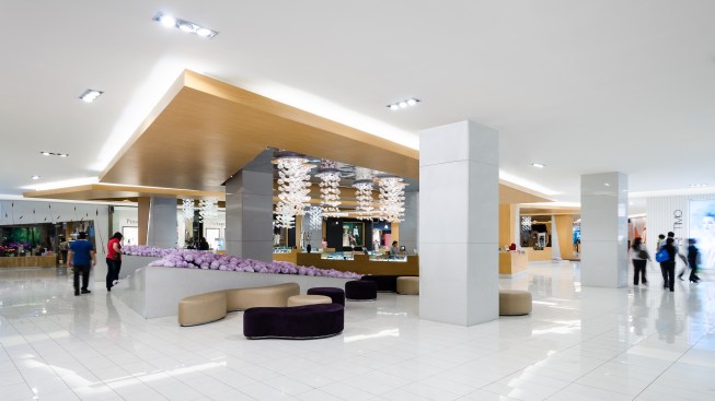 The ultimate challenge was to transform the dark, single-level, column filled parking level into an open and comfortable fashion district at human scale. The design solution creates a sensory experience for the shopper through the use of different design elements and materials. The combination of free standing boutique stores surrounded by pools of water and smart construction details successfully creates an innovative shopping destination that stands apart from the rest of the mall.