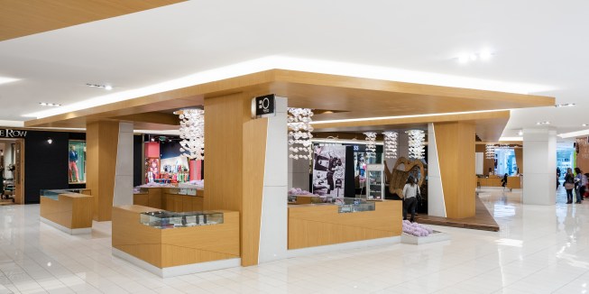The water elements are used as a visual, experiential and auditory design feature to connect the shopper in the space to the natural exterior environment. The shallow pools surround the public seating areas, engaging the shopper and giving a sense of protection. Warm wood patterns, relaxing seating groups and a color palette of cool colors and soft tones brands the area as a high-end shopping destination in line with the Aires brand.