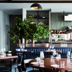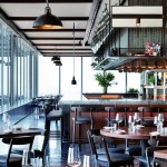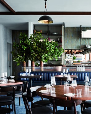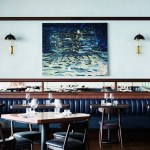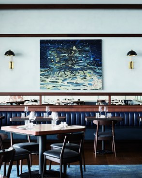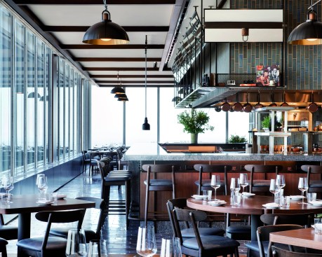 Perched on the 60th floor of the first International Style building in Lower Manhattan, the restaurant Manhatta and event space Bay Room just opened to great acclaim. Inspired by Walt Whitman’s “Manahatta” poem, the 90-seat restaurant celebrates the cultural and industrial history of the neighborhood, while echoing the midcentury sensibilities of the building. Together, Manhatta and the Bay Room encompass 38,000 square feet and offer stunning exposures on all four facades of the building, spanning north to Midtown, west and south to the Hudson River and the Statue of Liberty, and east to Brooklyn’s famous bridges and waterways. Manhatta’s 40-foot long, black walnut bar is one of the longest in the city and, with a backdrop of the island of Manhattan, creates a buzzy energy leading into the open kitchen and luminous wine wall. Beyond the kitchen is one of two serene dining areas, which feature warm woods and walnut tabletops, exposed stone, polished bronze ornamentation, and mid-century chairs. Muted and mature, Manhatta rejects glitzy gimmickry in favor of enduring materials in tones of honey, coffee, and deep aquamarine. Leather and walnut, granite and silk, brass and bronze compose the rich material palette. The arc pendant lights are perforated bronze, designed to minimize reflections on the picture windows.