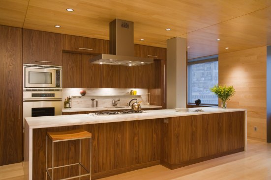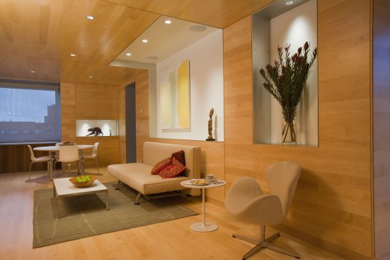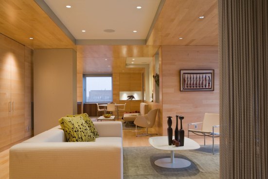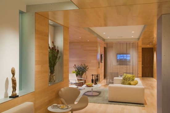 This project combines two adjacent units on the fourteenth floor of the “Level Club” condominium on Manhattan’s Upper West Side. The client wanted a contemporary, open feel with clean lines and ample use of natural materials. Technical limitations such as the presence of exterior demising walls separating the two units and a programmatic requirement for ample storage space posed significant challenges. The resulting design meets and exceeds all of the expectations of the client. A large, slot of space containing the public parts of the program (living /dining, kitchen and home entertainment center), becomes the main spatial figure surrounded by a poché of bedrooms, closets and bathrooms to maximize the use of “found” space. The clarity of the spatial figure is maintained through the use of precisely detailed and crafted white maple flooring panels on the floor, ceiling and walls; all openings are cased in anodized aluminum.