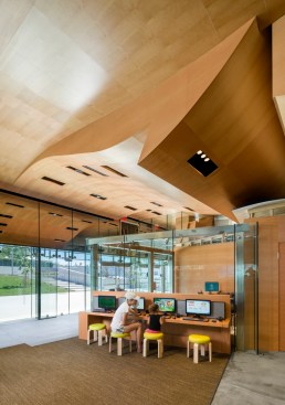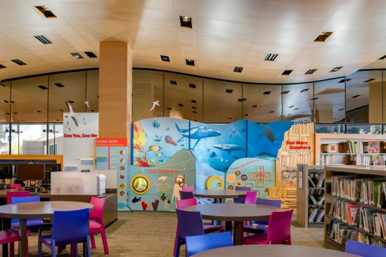 Children’s area including Family Place, an interactive learning wall, four early literacy computers, and an additional eight children’s access computers